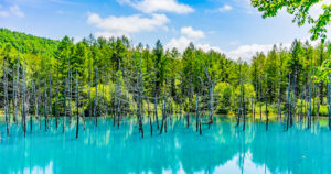 美瑛を代表する絶景スポットです。水面が神秘的な青色に輝く様子は、まさに自然が生み出したアートです。